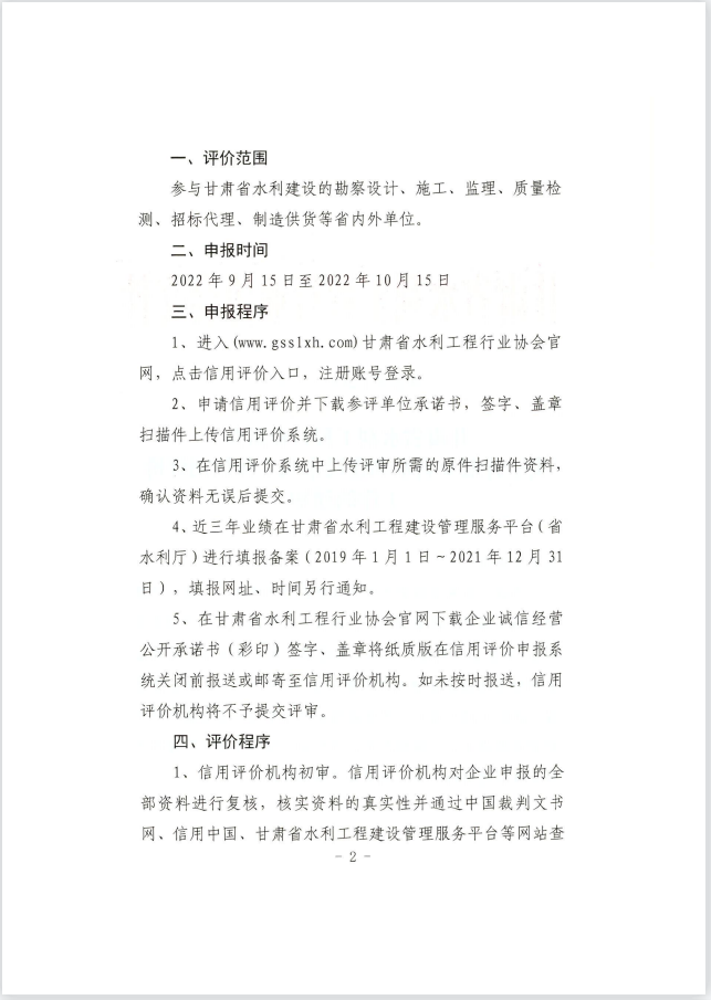 【信用評(píng)價(jià)】甘肅省水利工程行業(yè)協(xié)會(huì)關(guān)于開展全省水利建設(shè)市場(chǎng)主體信用評(píng)價(jià)工作的通知特別提示:信用評(píng)價(jià)申報(bào)系統(tǒng)自2022年9月15日0時(shí)正式啟動(dòng)至2022年10月15日24時(shí)關(guān)閉,為了便于協(xié)會(huì)與參評(píng)單位溝通銜接,協(xié)會(huì)建立六類(施工、監(jiān)理、設(shè)計(jì)、檢測(cè)、招標(biāo)代理、制造供貨)微信群,請(qǐng)各參評(píng)單位按照各自的類別聯(lián)系協(xié)會(huì)工作人員入群。